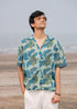 This unisex resort shirt is upcycled from an Ajrakh block printed Chanderi silk saree. It features bold leafy motifs and a subtle border print on the sleeves, exuding understated luxury.